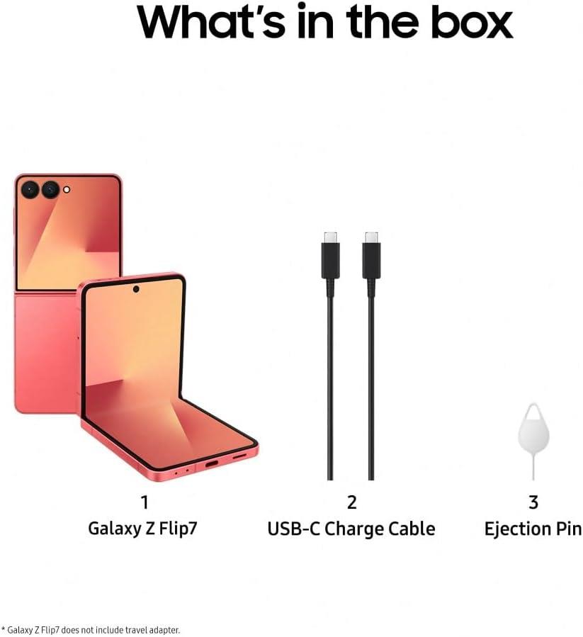 What is Included- Samsung Galaxy Z Flip7 256GB Foldable Smartphone 5G 6.7'' Unlocked - Coral Red UK Power Cable Meet Galaxy Z Flip7, your personal gateway for self-expression, & our most powerful pocketable Galaxy Z Flip smartphone yet. The new edge-to-edge 4.1-inch Infinity Cover Screen not only looks incredible, but also comes with Galaxy Al & Google Gemini Ask questions, set appointments and reminders, all before unfolding the handset to reveal the massive 6.9-inch screen. Now backed with 4,300mAh of battery power, so you're powered up all day. Pocket-sized perfection - Introducing the most pocketable Galaxy Smartphone yet, Galaxy Z Flip7. Slimmer, stronger and lighter than ever, with the all-new Infinity FlexWindow. Treat your selfie – With a whole host of AI features, Flex Mode and Galaxy Z Flip7's awesome 50MP dual-lens sensor, getting creative with selfies has never been easier. Pocket the power of AI – Galaxy AI and Google Gemini have a new playground, now fully optimised for use on the new FlexWindow, so you can get more done, even when Galaxy Z Flip7 is closed. Small but mighty – Don't let Galaxy Z Flip7's compact size fool you, it's packing a powerful Exynos 2500 processor and a long-lasting 4,300mAh battery for all-day power. Please note: In order to reduce e-waste, the manufacturer has chosen not to include a USB plug in the box. You can use an existing USB plug with the included USB cable or purchase one from our site. Please see the 'Box Contents' section below for more details. Model number: SM-F766BDBGEUB. Network: Display and Design: Dimensions: Camera and Video: Storage: Technical specifications: Battery: Product features: Connectivity: Box Contents: Energy efficiency information: General information: