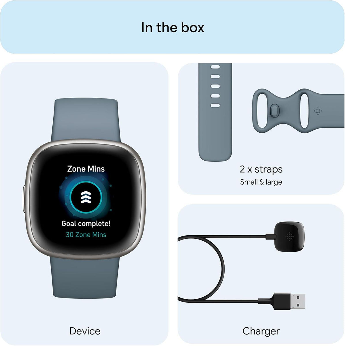 • Accessories included: Standard and large strap size, charger cable, including charger.